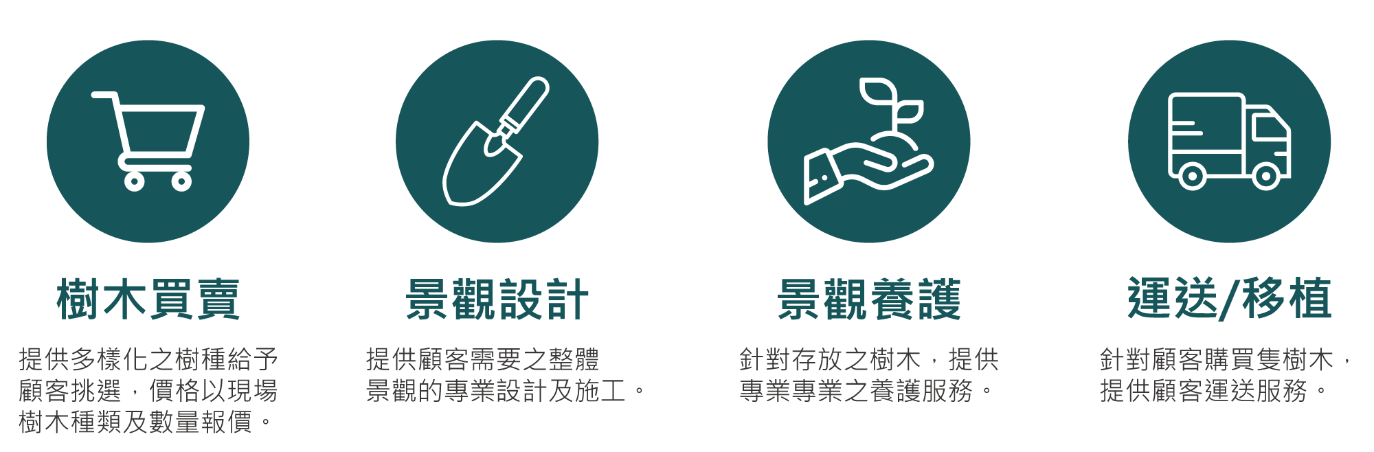 提供多樣化之樹種予顧客挑選,價格則以現場樹木種類及數量做報價